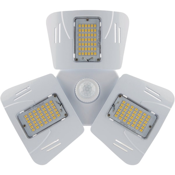 60-watt LED (light emitting diode) multi-beam utility light replaces high-wattage HID (175W equivalent) CFL (compact fluorescent) and incandescent (500W equivalent) lamps but uses only 60 watts. Compatible with a standard medium (E26) light socket. Features a built-in motion sensor. The high-lumen LED light panels adjust to 135 degrees and a full 180 degrees. The rugged construction makes it perfectly suited for use in garages barns workshops sheds utility rooms and other large open spaces. Long life: 50000 hours. Non-dimmable. cUL listed for damp locations.