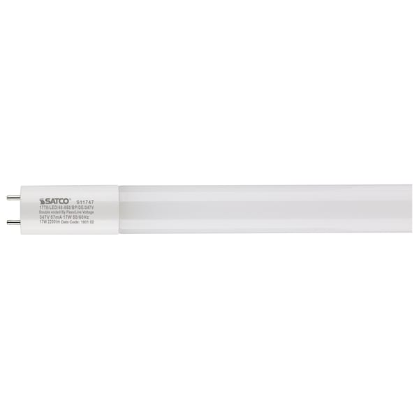 Satco's S11747 17-watt, 4-foot, 5000K LED lamp is part of a new generation of Type B ballast bypass lamps, designed to replace T8 and T12 medium bi-pin fluorescent lamps. These lamps are engineered for double-ended wiring and will not light unless the ballast is bypassed. Commercial venues, schools, hospitality, health care facilities - virtually any large-scale lighting application - will benefit from immediate energy savings and less maintenance. 347 volts for use in Canada.