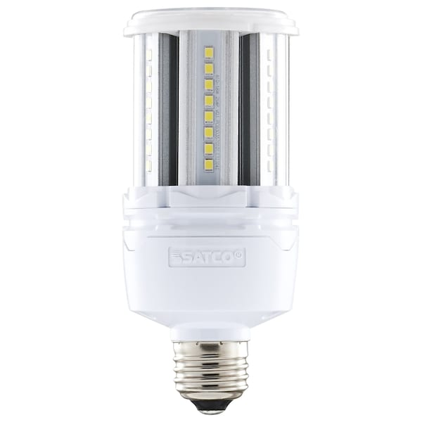 The SATCO PRODUCTS brand 18W LED HID Replacement - 80 CRI - 50K - E26 Base - Economy Hi-Pro is suitable for both indoor and outdoor usage. It features LED bulb technology with a bulb operating temperature range of -30C (-22F) to a maximum of +65C (+149F). The bulb has a white finish, a diameter of 2.39, a medium base type, 18 watts, a corncob bulb shape, a length of 5.45, a weight of 0.73, and is made of aluminum and polycarbonate. It has a voltage of 100-278.