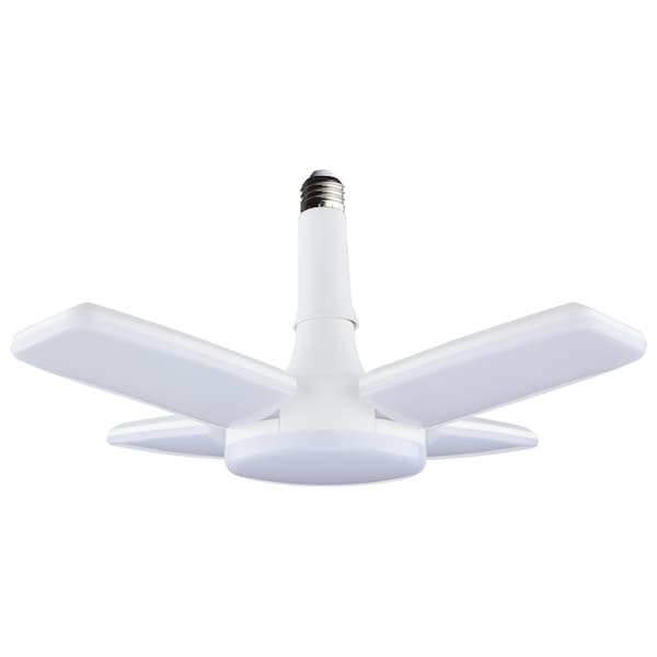 SATCO|NUVOs LED Garage and Utility Light, S13146, easily provides ample illumination to garages, workshops, utility rooms and more. Simply screw the E26 base into any standard lamp socket and adjust the LED panels as desired from 300 degrees when closed, to 100 degrees when fully open, to utilize the omni-directional light output. With 30 watts and 3,000 lumens and an impressive functional lifespan of 50,000 hours and a damp location rating, this lamp is engineered to provide long-lasting and reliable performance across a wide range of conditions and applications.