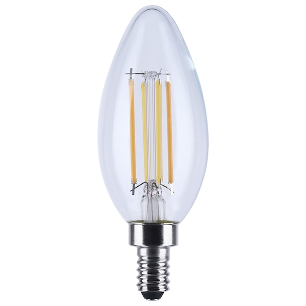SATCO NUVO's S12157 B11 Dim to Warm filament bulb offers a candle-like appearance with advanced dimming from 3000K to 2000K. Featuring a clear glass finish and E12 candelabra base, it's ideal for chandeliers, sconces, and accent lighting. With 360 degree light, 90 CRI, and wet location rating, this 120V lamp blends timeless charm with modern performance.