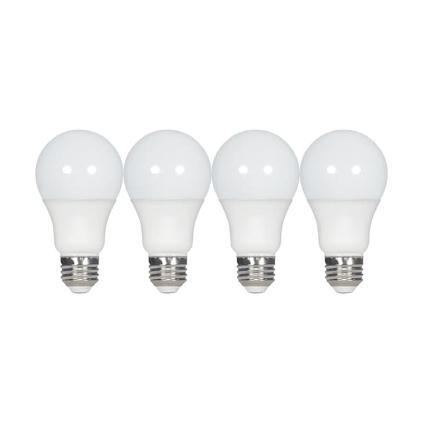 Satco's four-pack A19, 2700K, 9.5-watt warm white LED lamp replaces a standard 60-watt incandescent lamp. This lamp is Energy Star Listed, approved for use in totally enclosed fixtures, vibration resistant, and is damp location rated, making it very versatile. The lamp is both RoHS and FCC compliant.