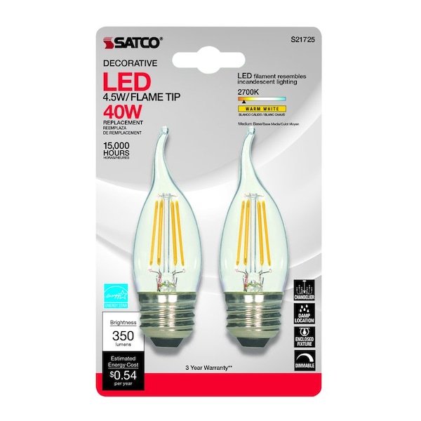 Satco CA10 (Flame Tip) E26 (Medium) LED Bulb Warm White 40 Watt Equivalence 2 pk