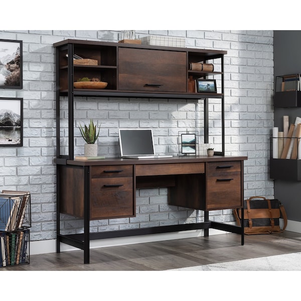 Give your office a promotion with this computer desk from the Briarbrook collection. This computer desk with hutch offers a spacious top surface that provides room for all the office essentials. This computer desk features a large middle shelf with a flip down panel for a keyboard and mouse to keep the desktop clutter free. Two small drawers with full extension slides provide convenient storage of supplies. This hutch for desk features a barrister style door that rotates up and in for hidden storage of binders, books, reports, and more. This metal and wood hutch features an open storage area with two adjustable shelves to accommodate items of various heights. The lower drawers that open on full extension slides accommodate letter or legal size hanging files. This computer desk with drawers provides the option for a Hidden Wireless Qi Compatible Charger by Eggtronics 425905 sold separately visit sauder.com for more information for convenient phone charging. Finished on all sides in Barrel Oak with added powder coated metal frame for durability and design, this industrial style home office desk with storage will look polished from every angle.