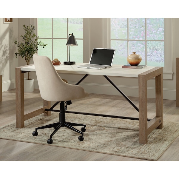 Invite the soothing simplicity of modern farmhouse into your office space with this commercial office desk. The base of this residential office furniture is finished in the natural, neutral tones of Brushed Oak with a Pebble White accent finish on the desk surface, for an elegant twist. This business desk has a powder coated metal support frame for a touch of rustic flair. The thick and lightweight panel construction of the executive desk from the Dixon City collection allows for easier portability in your home office space without sacrificing strength. Finished on all sides for versatile placement in a home office or living space, this metal and wood office desk meets BIFMA standard x5.9 for safety, durability, and structural performance. With the versatile selection of this highly configurable collection of office furniture, the executive desk is a blank canvas waiting to be styled with a complementary ensemble of contemporary country additions.