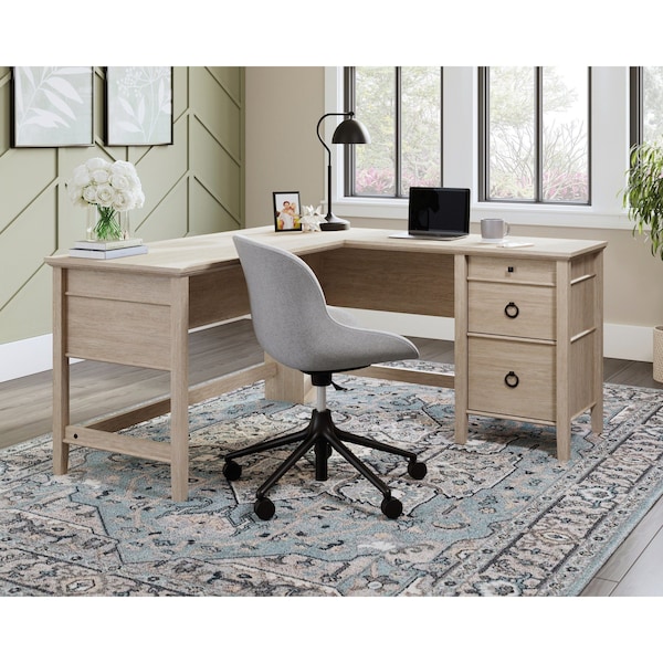 A glamourous home office updated with style and function. What more could you ask for? The L-shaped desk from the East Adara collection gives you just that. This L-shaped desk with drawers offers a spacious work surface that provides room for all your office must-haves like your laptop, stacks of notepads, writing utensils and your hot cup of coffee. This L-shaped desk with storage even has space for home dcor items like an accent lamp and decorative plants. An upper storage drawer that opens and closes on full extension slides and a lower drawer that can hold letter-size hanging files keeps your most important work items and files neatly organized and easy to find. Finished on all sides for versatile placement, this L-shaped computer desk will look polished from every angle. A Cascade Oak finish and rounded details makes this computer desk with storage everything you need for your home office and more.