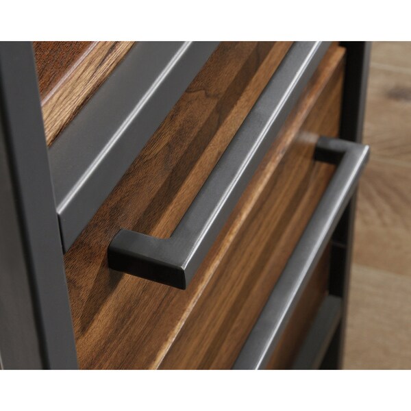 Find the motivation you need to tackle all your big projects when you give your home office a touch of modern style and design with this L-shaped desk from the Nova Loft collection. This metal and wood desk offers a spacious top surface that provides you with all the room you need for office essentials like your laptop, stacks of folders, notepads and your hot cup of coffee. There's also plenty of space for home dcor items like an accent lamp and framed photos. The two storage drawers open and close on smooth metal runners for easy access storage of all your miscellaneous supplies. There's also two open shelves for additional storage space for things like papers and envelopes. The file drawer with full extension slides can hold letter-size hanging files for increased organization. This home office desk is finished on all sides for versatile placement throughout any room in your home. Finished in Grand Walnut and paired with a durable, black powder coated metal frame, this L-shaped desk will have you feeling ready to work.