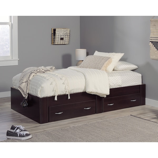 Looking to give your sleepy bedroom dcor a fresh and stylish new update? Well then, we have just the piece for you! This twin platform bed from the Beginnings collection is sure to add clean lines and sleek design to your bedroom so you can snooze in style. It features convenient under the bed storage with two large storage drawers that create an easy access space to stow away anything from stacks of sweatshirts and your abundance of shoes to board games and an extra set of sheets and blankets. You can find room for all your stuff! It accommodates a twin-sized mattress to give you a completed look, whether it is in your master suite or down the hallway in the guest room. It adds cozy style and simplistic beauty no matter where it rests. Finished in Cinnamon Cherry and detailed with stylish hardware, this attractive twin platform bed is everything your bedroom needs and more!
