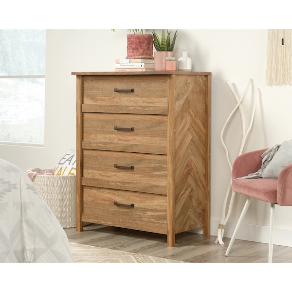 There is no such thing as having too much storage space, right? Right! Create versatile storage options while adding beautiful style and design to your bedroom with this 4-drawer chest from the Cannery Bridge collection. This dresser features four large drawers that open and close on smooth metal runners for easy access storage of a variety of different things like stacks of slacks and your favorite button-up shirts to big cozy sweaters and your collection of t-shirts. You can find room for all your things! Each drawer also includes safety stops for added safety for you and your family. This chest of drawers features a spacious top surface that makes an ideal place to store additional bedroom essentials and home dcor items like bottles of cologne, an accent lamp, your makeup bag and photos of your family and friends. The side panels of this 4-drawer chest feature a unique herringbone pattern that adds an extra touch of detail to your bedroom. Finished in Sindoori Mango, this handsome chest is just what you've been looking for.