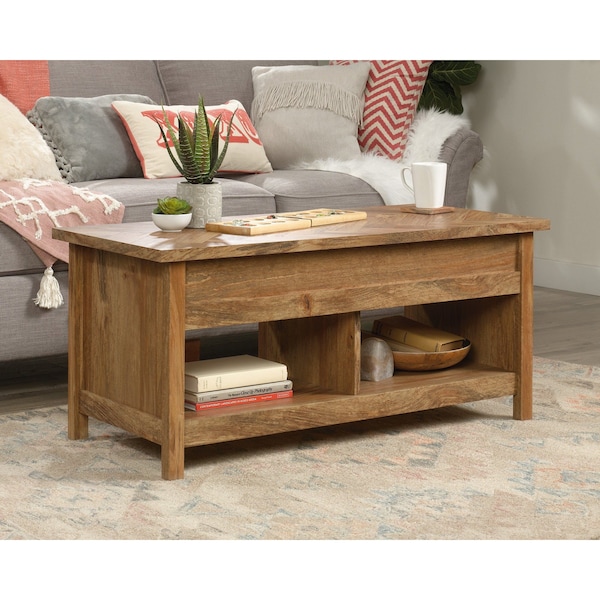 The center of your living room should stand out from the rest. Add beautiful style and convenient design to your home with this lift-top coffee table from the Cannery Bridge collection. This stunning lift-up coffee table offers a spacious top surface that lifts up and forward to create a multipurpose work space for you to work from home, browse the web on your laptop, or eat a delicious meal all while relaxing from the comfort of your couch or loveseat. Beneath its handy lift-top surface is hidden storage for you to stow away any around home essentials - spare blankets, board games, your collection of books and any other items you typically wouldn't want your guests to see. This coffee table with storage also features open shelving for additional space to stow away items like organizing bins or display home dcor like knick-knacks and picture frames. This flip-top coffee table is detailed with a herringbone pattern on the top surface for an extra touch of detail. Finished on all sides in Sindoori Mango, this unique coffee table with lift-top is just what your living room needs.
