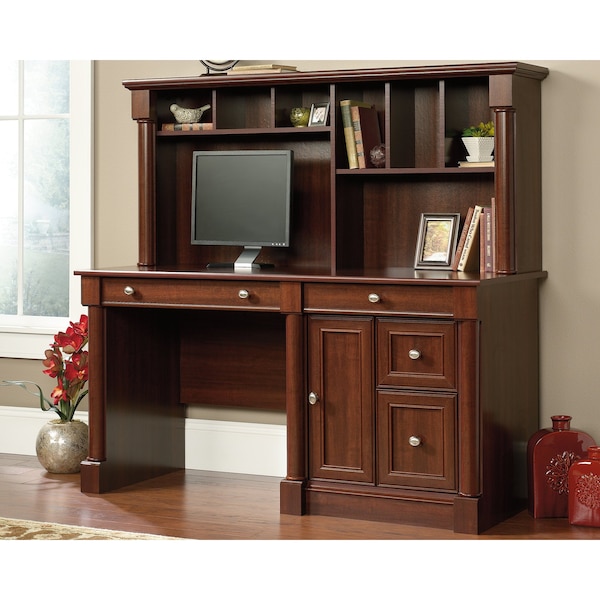 Give your home office or workspace a touch of traditional style with this computer desk from the Palladia collection. Its spacious tabletop surface offers room for all your office essentials - computer, important papers, and of course your coffee mug. It features a large, easy gliding drawer/shelf with a flip-down panel for your keyboard and mouse. It also includes two storage drawers that open and close on smooth metal runners. The lower drawer has full extension slides to hold letter-size hanging files. Behind the door is a hidden storage area with an adjustable shelf, but can also accommodate a vertical CPU tower. Its handy hutch includes cubbyhole and vertical storage compartments to provide you with easy access storage space for mail and papers. Its cord management system allows you to easily organize your cords and wires without all the mess. Finished in Select Cherry, this beautiful office desk will have your office space looking like a million bucks.