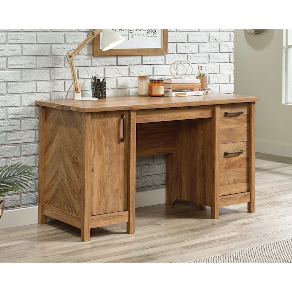 A lack of motivation is no match for a new, stylish desk. Give your home office or work space the upgrade that it needs with the charming good looks of this computer desk from the Cannery Bridge collection. This home office desk offers a spacious top surface that provides you with all the room you need for your must-have desk essentials like your laptop, a stack of notepads, your collection of pens and a hot cup of coffee! This computer desk features three drawers that open and close on smooth metal runners. The lower drawer holds letter-size hanging files to help keep your documents organized. Behind the door is a hidden storage area that includes an adjustable shelf and can hold a vertical CPU tower. This office desk is finished on all sides and features a herringbone pattern on both side panels for an extra touch of detail. Finished in Sindoori Mango, this stunning computer desk is just what your home needs.
