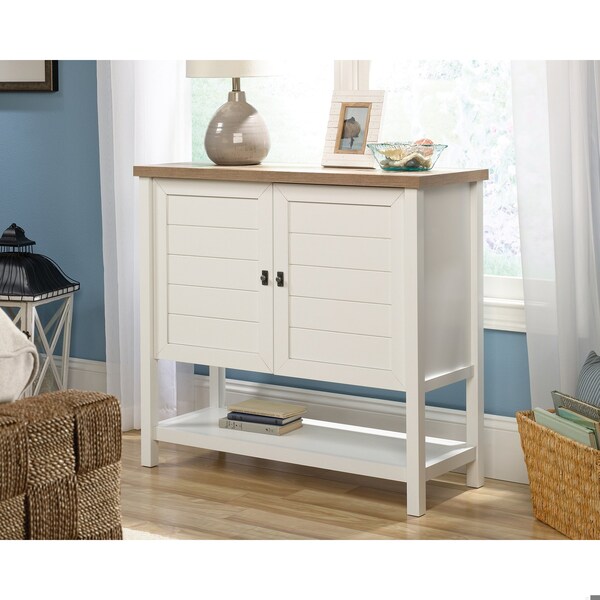 Need a solution for your clutter and chaos? Check out this storage cabinet from the Cottage Road collection. This bright and airy cabinet features hidden storage behind each of the doors along with two adjustable shelves for enhanced storage possibilities. It also features a lower open shelf for additional storage! Finished on all sides in Soft White with a Lintel Oak accent, this stylish cabinet will take your home from mess to yes in no time.