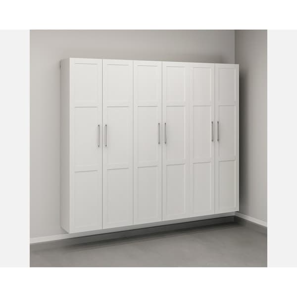 The third one will surely be the charm - of your garage, that is. The functional and fashionable shallow wall-mounted cabinet bundle from the GarageCore collection offers three storage cabinets with door kits - the trifecta of garage disorganization. These three wall-mounted storage cabinets are 15.5-inches deep and feature five adjustable shelves each, for optimal organization space. With 1.25in thick, strong and lightweight panel construction, each shelf holds up to 60 lbs. The melamine surface of these storage cabinets with doors are heat, stain, and scratch-resistant, making them ideally resilient for a more rugged atmosphere. These three melamine storage cabinets also have bottom shelves that can be raised or removed to accommodate heavier items on the floor. These tall garage storage cabinets mount securely to the wall with a metal rail system and cabinet braces, providing a professionally installed look that ensures easy cleaning underneath, in addition to protection from water and debris. This cabinet trio will brighten any garage space with a bright and neutral White finish, while effectively expanding living area and making spaces more enjoyable and usable. The included cabinet door kits provide stylishly framed tall cabinet doors with the same heat, stain, and scratch-resistant melamine surface. With stylish, geometric hardware on the doors, create hidden storage that keeps garage clutter under control.