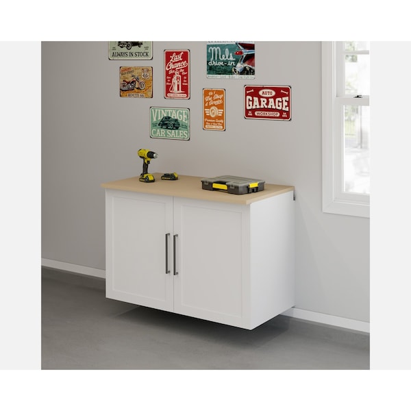 Maximize every inch of available space with the wall-mounted base cabinet bundle from the GarageCore collection. This garage base cabinet with doors mounts securely to the wall with a metal rail system and cabinet braces, providing stress-free installation, a professionally installed look and easy cleaning underneath, in addition to protection from water and debris. The two adjustable shelves of this melamine storage cabinet feature 1.25in thick, strong and lightweight panel construction, with a bottom shelf that will hold up to 60 pounds. The melamine surface of this wall utility cabinet is heat, stain, and scratch-resistant, offering long-lasting durability and dependability in the garage space. The cabinet door kit includes stylishly framed base cabinet doors with heat, stain, and scratch-resistant melamine surface and stylish, geometric hardware. Finished in bright and neutral white, and accented with a strong, dense, MDF wood countertop, this storage cabinet with doors and work top is a bundled combo that provides convenience and storage.