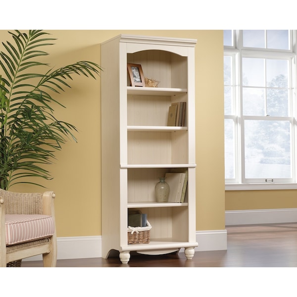 Finished in Antiqued White with solid wood turned feet, this cottage-style bookcase from the Harbor View collection is inspired by the bygone days of summers spent seaside. This storage bookcase features five spacious shelves ideal for storing and displaying anything from office supplies to powder room essentials or kitchen pantry staples. The three adjustable shelves will easily accommodate items of different shapes and sizes, from craft supplies to laundry room linens. This library with shelves also includes cord access through the enclosed back panel to keep wires tidy and out of site. The simple design and stunning appearance make this 5-shelf bookcase a perfect fit for any room in the home - from the living room to the bedroom. This tall library bookcase will add a touch of cottage-inspired style to a quaint little kitchen, an elegant dining room, or any space in between.