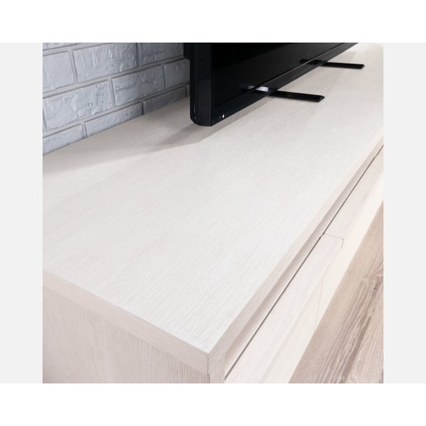 Add contemporary style and versatile storage space to the favorite hang-out spot with this large TV credenza from the Harvey Park collection. This credenza TV stand features four storage drawers that open and close on smooth metal runners for easy and convenient access to remotes, video game consoles, DVD collections, and more. The upper shelf is divided for easy and convenient storage and access to audiovisual equipment, as well as home decor items on display. This TV credenza with drawers accommodates up to a 86in TV weighing 135 lbs. or less, making it the perfect spot to binge a beloved sitcom, have all-day movie marathons, or play video games with the kiddos. This TV stand with opens shelves boasts a durable, 1in top for strong and dependable television display, all while emanating midcentury modern style. Finished in Alabaster Oak, the simple, classic style of this TV credenza will foster quality time with family and friends.