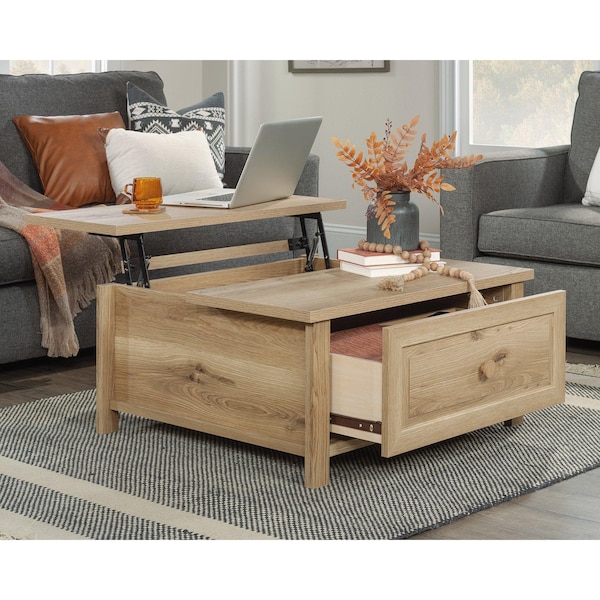 Come on in and sit a spell, with the farmhouse lift-top coffee table from the Hillmont Farm collection. This pop-up coffee table offers a durable, 1-inch-thick surface - a perfect place to rest your steaming mug of coffee. As your coffee cools, plunk your laptop on the partial lift-top surface that raises up and forward to create versatile work surface from the comfort of your sofa. This coffee table with lift-top also features useful storage, both beneath the split top surface, and a drawer that easily slides open on metal runners with safety stops. Finished on all sides in cozy and warm Timber Oak, this lift-top coffee table with storage offers versatile placement in any living room or family room setting for a handsome and handy touch of country charm. With simplistic elegance of natural woodgrain, this lift-top coffee table with drawer will be easy to incorporate into any home decor.
