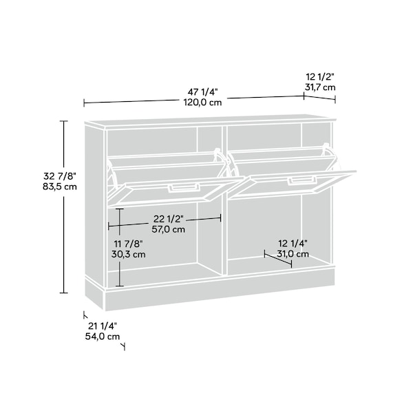 Give your footwear a space of its very own with the shoe storage cabinet from the HomePlus collection. With a neutral White finish, this shoe cabinet with cubby storage will blend anywhere in the home, from the utility room to the garage to an elegant entryway. Trip over wayward shoes no more! This short shoe cabinet saves floor space while providing tidy and compact shoe organization. The two tilt-out doors conceal storage compartments that hold up to six pairs of average size shoes in each door! An adjustable divider within each compartment allows versatile placement for different shoe styles. In addition to all that hidden storage, this flip drawer shoe cabinet provides two open cubbies for additional storage below. Some shoe racks can be the functional eyesore of the home. This shoe organizer cabinet has all the classic elements of a stylish credenza, while prioritizing the needs of modern family storage.
