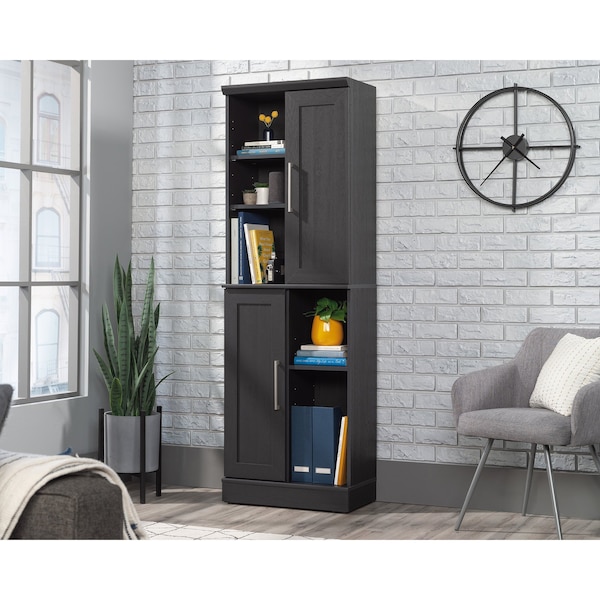 Craft supplies have met their match; pantry items and bed linens prepare to be organized; introducing the modern storage cabinet from the HomePlus Collection. This multipurpose 2-door storage cabinet has an easily configurable design which allows its doors to be positioned on the top, bottom, left or right. With six adjustable shelves, this double door storage cabinet will provide the ultimate versatility for storage of all items, big or small; whether it's tall vases of flowers, bins of toiletries, or baskets of snacks. Perfect for a laundry room organizer or a kitchen pantry extension, this storage cabinet with doors has pulled out all the stops. The enclosed back panel of this engineered wood storage cabinet provides cord access for easy and convenient cable management for electronic devices and adjustable base levelers give an added stability. Finished in the dark and stately Raven Oak, this storage cabinet will take your clutter to classy in no time at all.