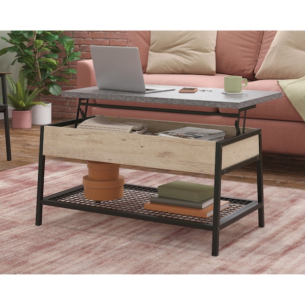 Is your couch too comfy to leave but you still have work to get done? We have a solution for you. This lift-top coffee table from the Market Commons collection is the best of both worlds. The top of this storage coffee table lifts up and forward creating a multipurpose surface so you can work, browse online, or eat dinner while relaxing on your couch. With a lightweight, 1 in. panel construction, this lift-top coffee table with storage is easy to assemble and durable to last through years of movie marathons. Beneath the top surface of this coffee table with lift-top is a hidden storage area that is ideal for items like blankets, books, the remote, and more. The lower open wire mesh shelf provides you with even more space to store and display things like organizing bins, board games and home dcor. This coffee table with storage is finished on all sides for versatile placement throughout your home. Finished in Prime Oak with Slate Gray accent, this lift-top coffee table is the perfect statement piece in any room.