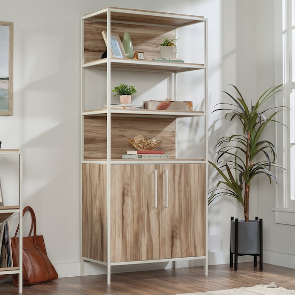 Feature the dcor you want to display while hiding the items you don't, with this 5-shelf bookcase with doors. This versatile, open shelf bookcase provides efficient function and extensive storage simultaneously, with three spacious, open shelves that will make room for your vast selection of novels, binders, children's books, photos, collection of figurines, awards, trophies, or anything you could ever want to display. Meanwhile, this storage bookcase with doors provides a hidden area with an adjustable shelf allowing versatile space for any non-display items of all shapes and sizes. The back panels are removable and adjustable, allowing for the expression of your personal style. Finished in Kiln Acacia and paired with a durable white powder coated metal frame, the natural and neutral finish provides the versatility to fit in to any home dcor. This metal and wood bookcase is the additional storage solution you've been needing.