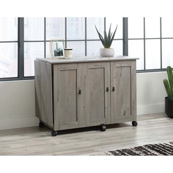 Sewers rejoice! Create a convenient workspace for all your sewing and crafting needs while adding beautiful style to any room in your home with this sewing/craft cart from the Sauder Select collection. This drop leaf craft table offers a spacious top surface that provides you with the room you need for all your supplies like your sewing machine, spools of thread and jars of buttons. Need additional work space? We got you covered. The drop leaf table top provides you with the extra space you need for sewing and crafting. This sewing and craft table features easy access storage behind its roll-open doors that includes two storage bins and a hidden shelf for your sewing machine. Behind the door it also features two adjustable shelves that can move to different heights to create flexible storage for items of all shapes and sizes. This rolling sewing table includes easy-roll casters so it can conveniently move to wherever you need it. Finished in Mystic Oak, this sewing craft table will have you feeling ready to work!