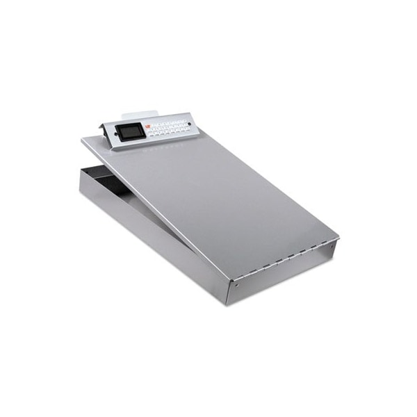 Portable desktop provides a hard surface for readable work and a 1.5in storage compartment underneath clipboard cover with separate section for pens and pencils. Self-locking latch keeps the compartment securely fastened. Compartment for the form holder/clipboard opens at the top. High-capacity clip holds up to 1in paper and includes a built-in license/card holder. Form holder is made of aluminum with a high percentage of recycled material. Built-In CalculatorEight-digit LCD calculator features auto shut-off and replaceable battery for dependable performance. Holds Paper Size: 8.5 x 11; Clipboard Actual Size: 9 x 14.5; Clipboard Material: Recycled Aluminum; Clip Capacity: 1in.