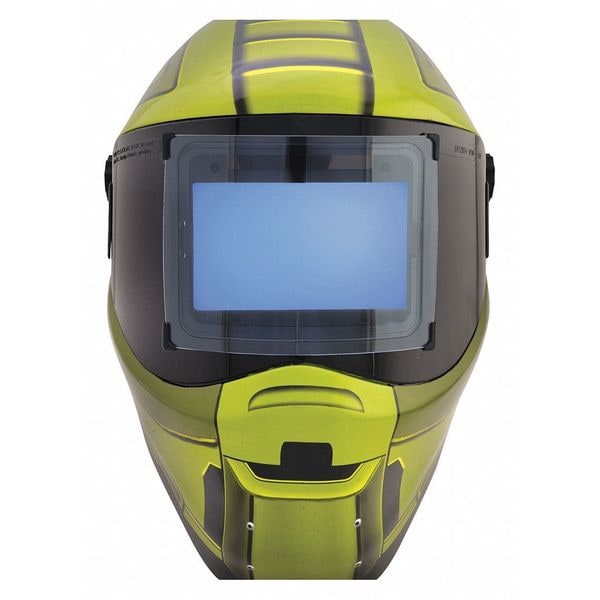 Welding Helmet, ADF Controls Knobs, Battery Life 6 mo, Battery Type (2) CR2450 Lithium, Solar Cells, Color Green/Black, Features Auto Shade 3/10 ADF, Graphics Lines, Grind Mode No, Helmet Material Plastic, Helmet Type Auto-Darkening, Number of Arc Sensors 0, Power Source Battery and Solar, Series F, Standards ANSI, Switching Speed 1/20,000 sec, Viewing Area 3.93 in x 2.63 in