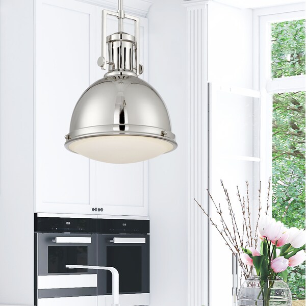 Industrial-chic style is exemplified by vintage details and understated, practical design. The Chival pendant is no exception. It has the splendid, uncluttered appearance of a vintage commercial fixture, and an elegant metallic finish of polished nickel. Classic white opal, etched glass adds to the charm. One 60W, E-style bulb provides plenty of illumination, as imagined by designer Karyl Pierce Paxton. And the size is terrific to install alone, in pairs, or several grouped together: 11? wide and 17? high, with an adjustable hanging height up to 48.5?. A perfect, solid, high-quality pendant with vintage appeal for your dining area, kitchen, living room, family room, foyer, great room, office, or stairway.