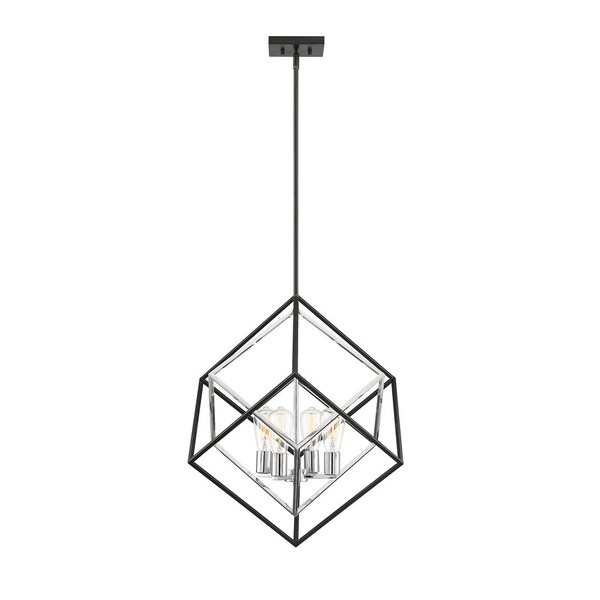 Artful, geometric joy with rectangles, squares, and diamonds ?neatly arrayed and illuminated in this thoroughly contemporary design. Four 60W E-type bulbs provide warmth and light, and they're beautifully framed, seeming to float at the heart of the design. The crisp angles are accentuated by the contrasting matte black and polished chrome finishes, and the shapes shift as you view this pendant from various perspectives. The suspension rod smartly transitions from matte black to chrome. This Dexter pendant is 25" wide, and with four 12? extensions included, has an adjustable height of 28 to 85". A stunning creation that will play in any room, almost certain to take you into next-level elegance. Perfect for your foyer, dining room, living room...even your "rhombus room."