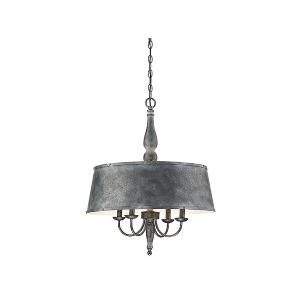 The Dover chandelier is a new classic, bringing urban farmhouse chic to your home. A four arm chandelier structure has graceful elements, such as curved upswept arms, a sculptural column, classic candle cups, and rounded finial. This traditional style frame is given a rustic look, surrounded by one large metal, tapered drum shade with rivet accents. A dappled grey, textural, tin finish completes the on-trend, modern farmhouse aesthetic. There are four 60W, C-style bulbs in the 22? wide and 26.5? high fixture for ample, stylish illumination. And it has plenty of pastoral charm for your dining room, kitchen, living room, family room, bedroom, office, or game room.