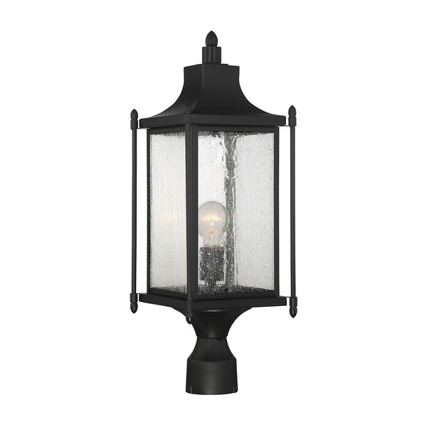 Featuring a design that is classic Americana, this light fixture adds timeless elegance to the outdoor areas of your home. A high quality black finish blends incredibly well with many other hardware types and architectural materials. The traditional box shape is enhanced with slim outer columns, delightful finials, and a graceful, curved mansard roof. Panes of beautiful, clear, seeded glass add to the vintage charm. And this post lantern holds one 60W, E-style bulb, for ample, safe, and welcoming illumination. It?s 8? wide, 23.5? high, and UL rated for wet locations ? perfect to give inviting, classic style to your walkway, patio, pergola, garden, driveway, or other outdoor living areas.