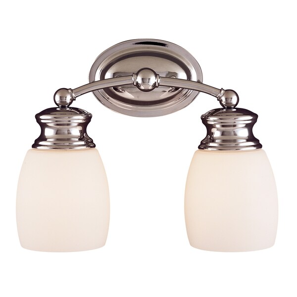 You want to feel comfortable when you step up to the vanity mirror, and that?s exactly what happens with the Elise. The traditional style is clean-lined and familiar, and the light is flattering, without any glare. The oval wall plate holds a graceful, curved arm and handsome glass holders, featuring nicely decorative, yet uncluttered, detailing. And this entire structure has a sparkling, polished chrome finish. Tapered cylindrical shades are made of lovely, frosted opal glass, and surround two 60W, E-style bulbs. The bath bar is 12.25? wide, 10? high, and UL rated for damp locations. It may be mounted as uplight or downlight ?the perfect fixture for luxurious, inviting style in your bathroom or powder room.