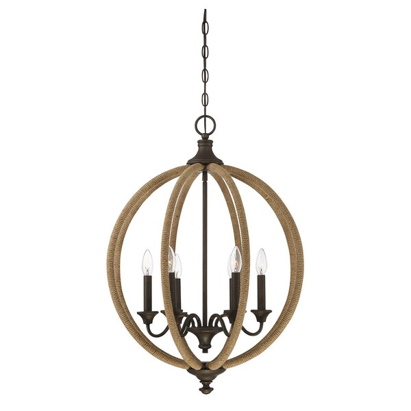 Rustic elegance at its best! The Findlay pendant has unpretentious warmth that you?ll love in your modern farmhouse, transitional, rustic chic, or new French country decor. It has a simple, natural, earthy, color palette courtesy of a wonderful, rope-wrapped open orb frame ?plus a charming patina from the artisan rust finish. Within the airy globe frame is a traditional candelabra, holding six 60W, C-style bulbs. A stylish finial at top and bottom add to the casual splendor. This pendant is 22? wide and 30? high: a perfect fit to add modern rusticity to your dining room, kitchen, family room, living room, entryway, bedroom, office, great room, or stairway.
