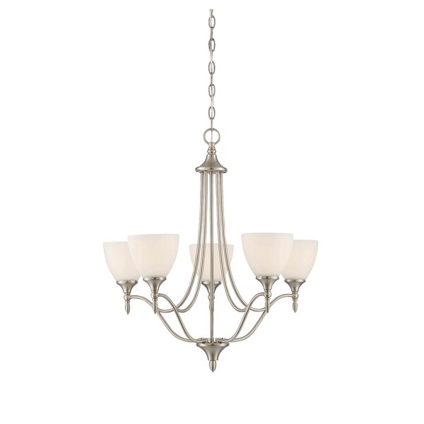 Great lighting is a key piece of excellent home design, and the Herndon chandelier is a solution to that puzzle! The pewter-like, satin nickel is a timeless finish. And streamlined, finely crafted details ?like the ball and cone finials and the simple, curved cup shade holders? create a clean, classic design that looks terrific. The style is familiar and pleasant, which sets a serene and relaxed mood. A nicely detailed bottom finial and central column connect to five graceful, arched light arms with smooth, white glass shades. Five 60W, E-style bulbs provide soft, flattering light, ensuring you and your guests are comfortable. This chandelier is 26? wide and 27.5? high: a stylish fixture with casual elegance you?ll enjoy for years to come.