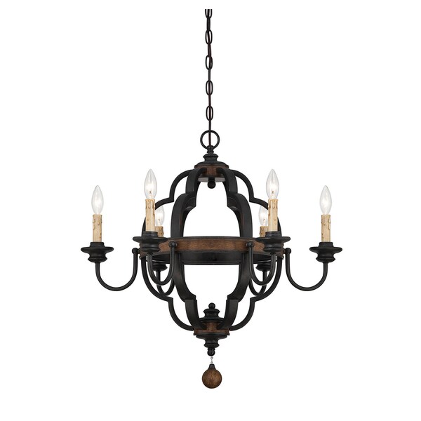 This weightier version of the popular Savoy House Kelsey chandelier features the same black metal, Durango finish accents and cream drip candle covers as the original Kelsey, but with a bit more drama. This Kelsey is slightly more compact and ornate with a heavier central frame and a few more curves. It?s great for a bedroom, master bath, kitchen, family room, office, dining room or entryway chandelier. Its black metal, rich wood-toned accents and old world styling make it an ideal interior lighting choice anywhere a warm, rustic look is wanted. Beautifully designed and crafted with quality materials right down to the polyresin finial, this striking chandelier will provide countless years of enjoyment ? and compliments.