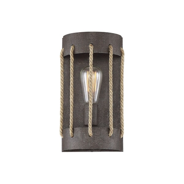 With rope, bronze, and an artisan-rust finish, this wall sconce begins with "found material" and recasts the industrial look as expressionistic art. Rope is looped lengthwise through the bronze body of the structure. And one 60W, E-type bulb casts light through the rough-material components. The Leland will work wonders with your industrial or modern farmhouse decor? or in any aesthetic where the texture of the materials is part of the overall look. The Leland is 8? wide and 13? high, so it?s easy to group one or more together in your dining area, kitchen, family room, home bar, foyer, hallway, office, or stairway.