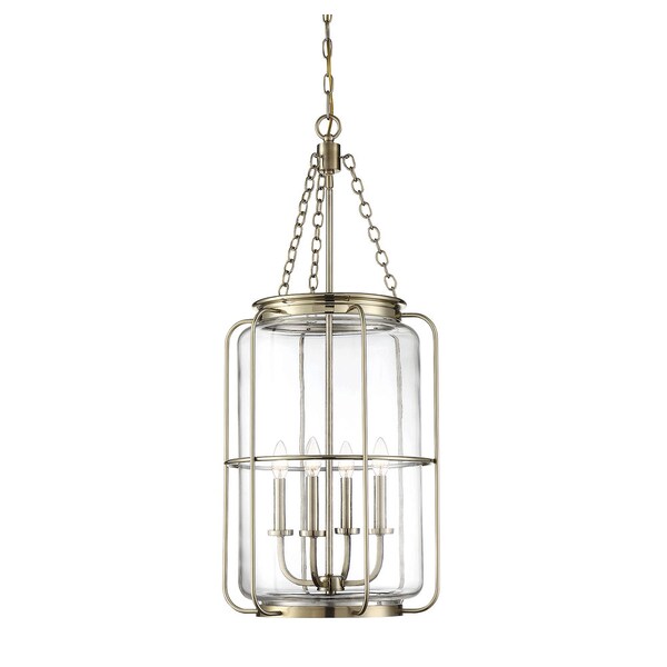 This Magnum pendant hits the ?sweet spot.? It?s a perfect balance of contemporary sleekness and vintage charm. The open cage frame, slim chains and downrod, and canning jar-like caps have a neutral, light brass finish. A clear glass shade encloses the streamlined inner candelabra. Altogether, it has a wonderful, retro-industrial and modern farmhouse aesthetic. Classic, practical design combines with a new, Noble brass finish for a look that?s right on target. And four 60W candle-style bulbs provide illumination that?s comfortable, cozy, and very livable. This fixture will hit the style mark in your dining room, kitchen, family room, entryway, bathroom, office, or craft room. Group a few together over your kitchen island, home bar, or gaming area.