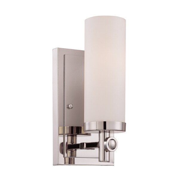 Big Apple style can be yours with this chic Manhattan wall sconce. Its sleek, streamlined design provides exactly the refined, clean look that everyone appreciates. The geometric frame has smooth, finely crafted detailing, and a gleaming, polished nickel finish. And the cylindrical shade is made of beautiful, etched, white opal glass. One 60W, C-style bulb within the shade, allows flattering, glare-free illumination. This sconce measures 4.5? wide, 9.5? high, and extends 4.5? from the wall ?and every inch has uptown high style. It?s both elegant and modern, and perfect for the walls of your bathroom, powder room, dining area, living room, entryway, family room, office, media room, hallway, or great room.