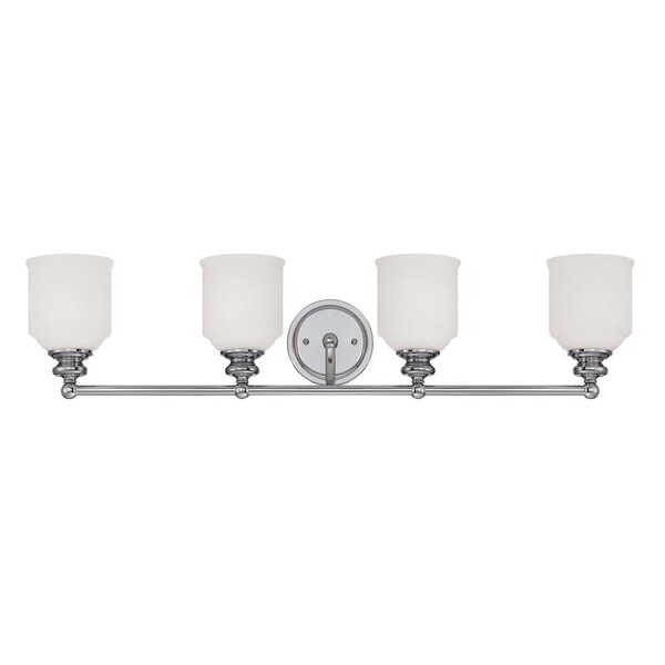 From Savoy House, the Melrose 4-light bath vanity bar stylishly updates classic Americana design for today's interiors. It features modern lines, white opal glass shades and a polished chrome finish. It may be mounted as either uplight or downlight. Bath bar lights are a classic choice for illuminating vanity mirrors in bathrooms big and small. The polished chrome finish can be paired with chrome hardware or mixed with hardware in other finishes. Bring Melrose into bathrooms of traditional, transitional or classic style to improve the look and the lighting. When you choose a Savoy House lighting fixture, you can be certain you?ve selected a piece that will withstand the test of time.
