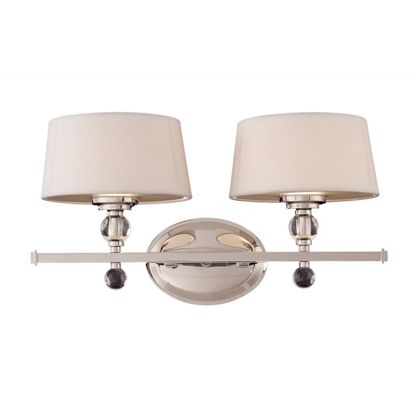 The Murren bath bar has traditional style with contemporary flair. The two classic white, tapered drum shades look clean and crisp ? a perfect complement to the sleek, polished nickel finish of the frame. The rounded shapes of the oval wall plate, light arm detailing, and finials, have a modern aesthetic that keeps the overall appearance streamlined and chic. It?s a lighting design that works well in transitional, contemporary, and traditional decor styles. Two 40W, G9 bulbs are included, providing ample, glare-free illumination, which is what you want in the bath. The Murren is 18? wide, 9? high, and extends 9? from the wall. And it?s UL rated for damp locations: a great fixture for elegant style in your bathroom or powder room.