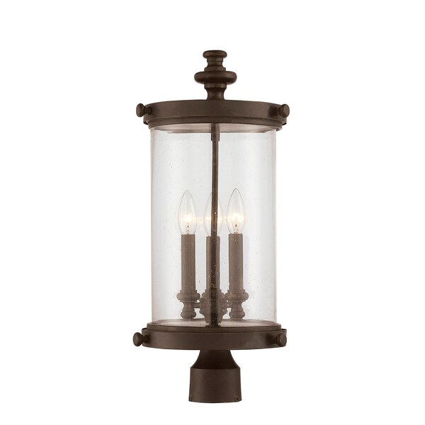 The elegant style and charming, vintage aesthetic of the Palmer lantern will provide a warm welcome, and beautify the exterior of your home. This delightful post lantern is a Karyl Pierce Paxton design, and features a decorative, ringed, upper finial. There are bold, wide bands at the top and bottom of the cylindrical shade ?and the entire frame has a lovely, bronze-like, walnut patina finish. The cylinder-shaped shade is made of clear seeded glass, adding to the vintage appearance, and allowing three 40W, C-style bulbs to shine. It?s 9? wide, 22? high, and overall, a timeless and stylish fixture for your patio, walkway, pergola, or other areas of your outdoor living space.