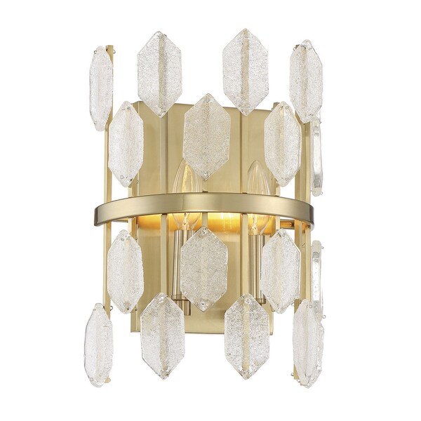 Contemporary design meets traditional materials for the best of both worlds. The Royale sconce is an impeccable choice for transitional, modern, and traditional decor. Many slim rods, arranged around a central ring, hold hexagonal pieces of glass for a delightfully modern, geometric silhouette. Beautiful clear, textured Piastra glass provides classical panache. And the warm, light Noble brass finish adds a luxurious touch for an overall elegant and stylish appearance. There are two 60W candle-style bulbs within the circle of glass pieces, providing a lovely glow. This sconce is 9? wide by 13.5? high: a perfect size to place in pairs or group several together for high-style effect.