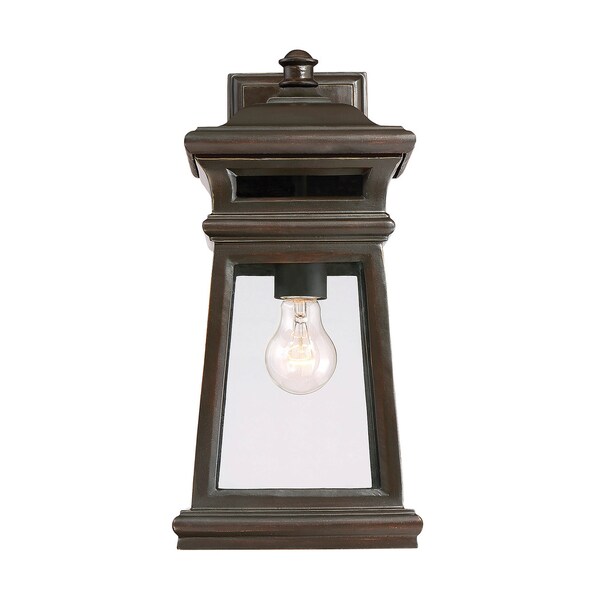 The Taylor wall lantern will brighten your home?s exterior with welcoming light and classic style. A streamlined, four-sided, traditionally shaped lantern has bold, tiered outlines, a solid rectangular wall plate, and a delightful hip-style roof with top finial. Panes of pristine, clear glass allow one 60W, E-style bulb to really shine. The lantern has a rich, English bronze with gold finish and is constructed of weather resistant Endure-All. Produced with injection molding, Endure-All is non-corrosive and UV resistant, for unparalleled durability. This lantern is 8? wide, 16? high, and extends 8.5? from the wall. Plus, it?s UL rated for damp locations: perfect for your porch, patio, sunroom, or pergola.