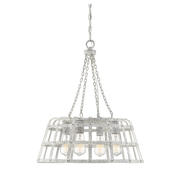 Bring all the elegance and rustic charm of the French countryside into your home with this lovely Westbrook pendant. The Savoy House Charisma finish has the wonderful look of distressed wood and the light-colored, soothing hue keeps the mood relaxed. Four downward-facing E-style 60W bulbs are exposed within a circular, basket-like frame. The fixture, suspended with light chains, has an open and airy structure, allowing light to fill your room. This pendant is both high interest and serene, blending easily with traditional, farmhouse, transitional, and modern vintage decor. 22? wide and 26? high for a natural yet refined, finishing touch in your dining area, kitchen, family or great room, entryway, or other living spaces.