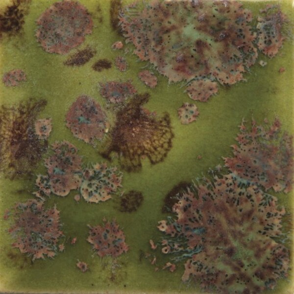 Sax True Flow Pagoda Green Colorburst Glaze is Semi-Opaque and is ideal for one-of-a-kind pieces since every application and every firing will produce different results. Creates multi-colored patterns as well as designs when fired. Create unique dramatic effects by combining other glazes of a similar firing range. Color turns gold brown and crystals will be orange with blue/purple halo. Freeze/Thaw stable. Not dinnerware safe due to surface characteristics.
