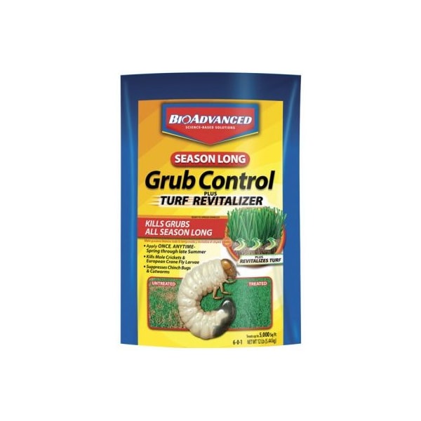 SBM BioAdvanced 12 lb. 5000 sq. ft. coverage Season Long Grub Control. Improved formula kills Grubs all season long plus revitalizes the lawn. Apply anytime spring through summer also kills Mole Crickets & European Crane Fly Larvae supresses Chinch Bugs & Cutworms. Exclusive patented 2 In 1 formula contains Merit.