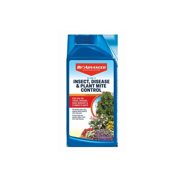 SBM BioAdvanced 32 oz. 3-in-1 Insect Disease & Mite Control Concentrate non-Neonicotinoid. For use on flowers & shrubs kills on contact cures & prevents diseases. Rainproof protection and lasts up to 30 days. The only product with Tau Fluvalinate highly effective miticide compound. Active ingredients: Tau-Fluvalinate & Tebucomazole.