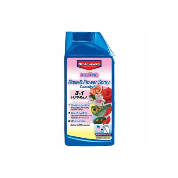 SBM BioAdvanced 32 oz. Concentrate All-in-1 Non-Neonic Rose & Flower Spray. 3 systemic products in 1 fertilizer promotes strong roots & beautiful blooms. Insect control for Japanese Beetles Aphids & other listed pests & disease control for Black Spot Powdery Mildew Rust & Southern Blight.